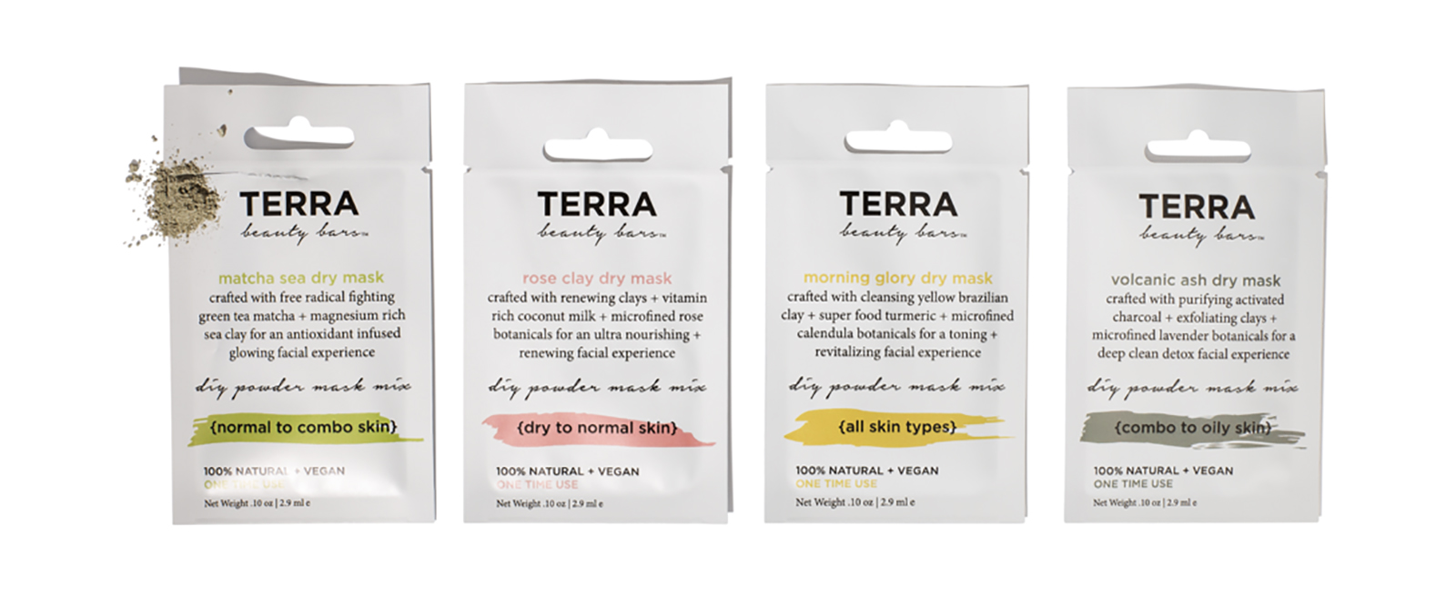 TERRA Beauty Bars 的明星商品抹茶、玫瑰和火山灰面膜,以精練的椰子油、荷荷葩油浸泡天然金盞花、茉莉、芙蓉花、薰衣草和洋甘菊的身體頭髮滋養油,還有以椰子油為基礎的牙齒亮白膏,都是 TERRA Beauty Bars 著名的 Waterless Beauty 無水美妝產品。