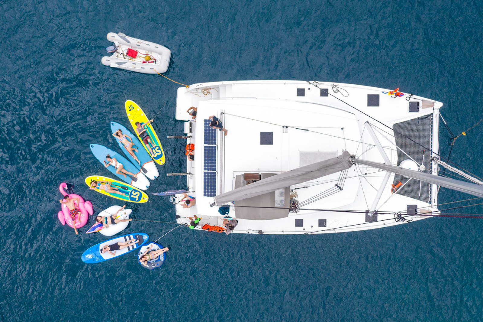 後來船長將船開到平靜的海面,讓我們能跟著好友們跳進海裡體驗刺激的水上活動,當天別艘船的旅客直接滑著 SUP (Stand Up Paddle) 跑到我們的船上跟我們聊天,我們像是在辦大型的派對,到處跟別人聊天。在夕陽西下時我們划著 SUP 感受大自然裡的平靜。船長說如果你幸運的話,遇到海浪平靜的時候還能體驗被小遊艇拉著衝浪,在海面上奔馳的快感。