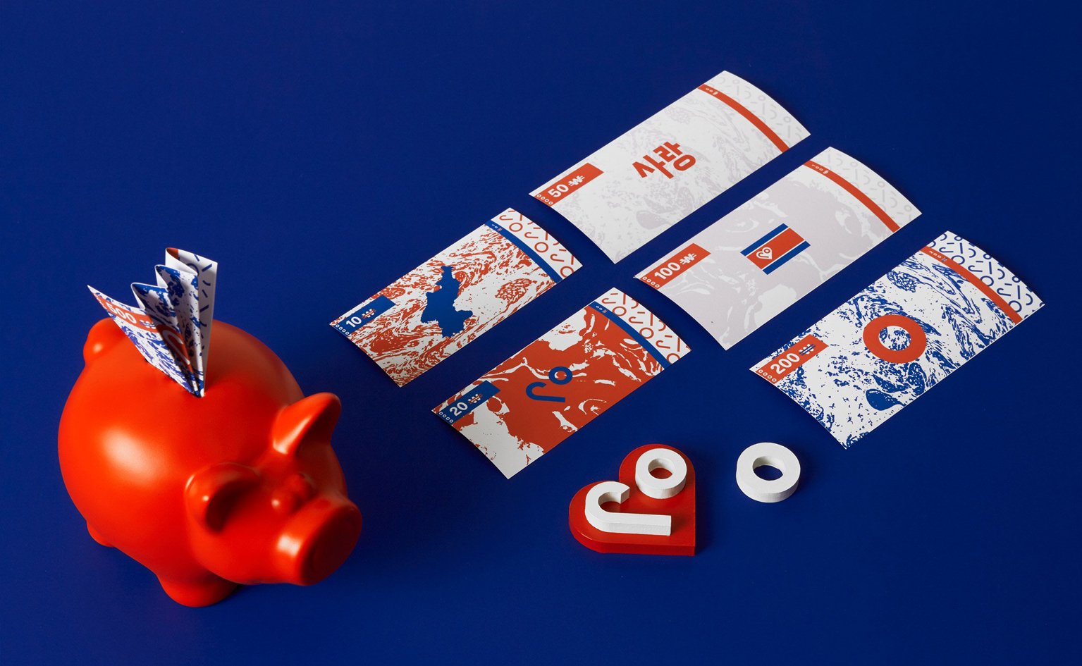 既然是誠心誠意的創意,Snask就大發慈悲地放送,將北韓國旗上的五芒星變成愛心,將北韓從「North Korea」變成愛韓「Love Korea」,要讓這個全世界最神祕的國度,變成歡迎世界各地遊客的旅遊勝地。不只國旗換上了愛心,連紙幣也設計得非常有當代藝術感,分別有10、20、50、100、200面額的「新北韓圜」,搭配紅色小豬撲滿,讓北韓人民儲蓄脫貧。